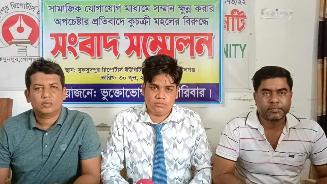 গোপালগঞ্জের মুকসুদপুরে সামাজিক যোগাযোগ মাধ্যমে পারিবারিক সম্মান ক্ষুন্ন করার প্রতিবাদে কুচক্রী মহলের বিরুদ্ধে সংবাদ সম্মেলন করেছে ভুক্তভোগী মীর পরিবার।